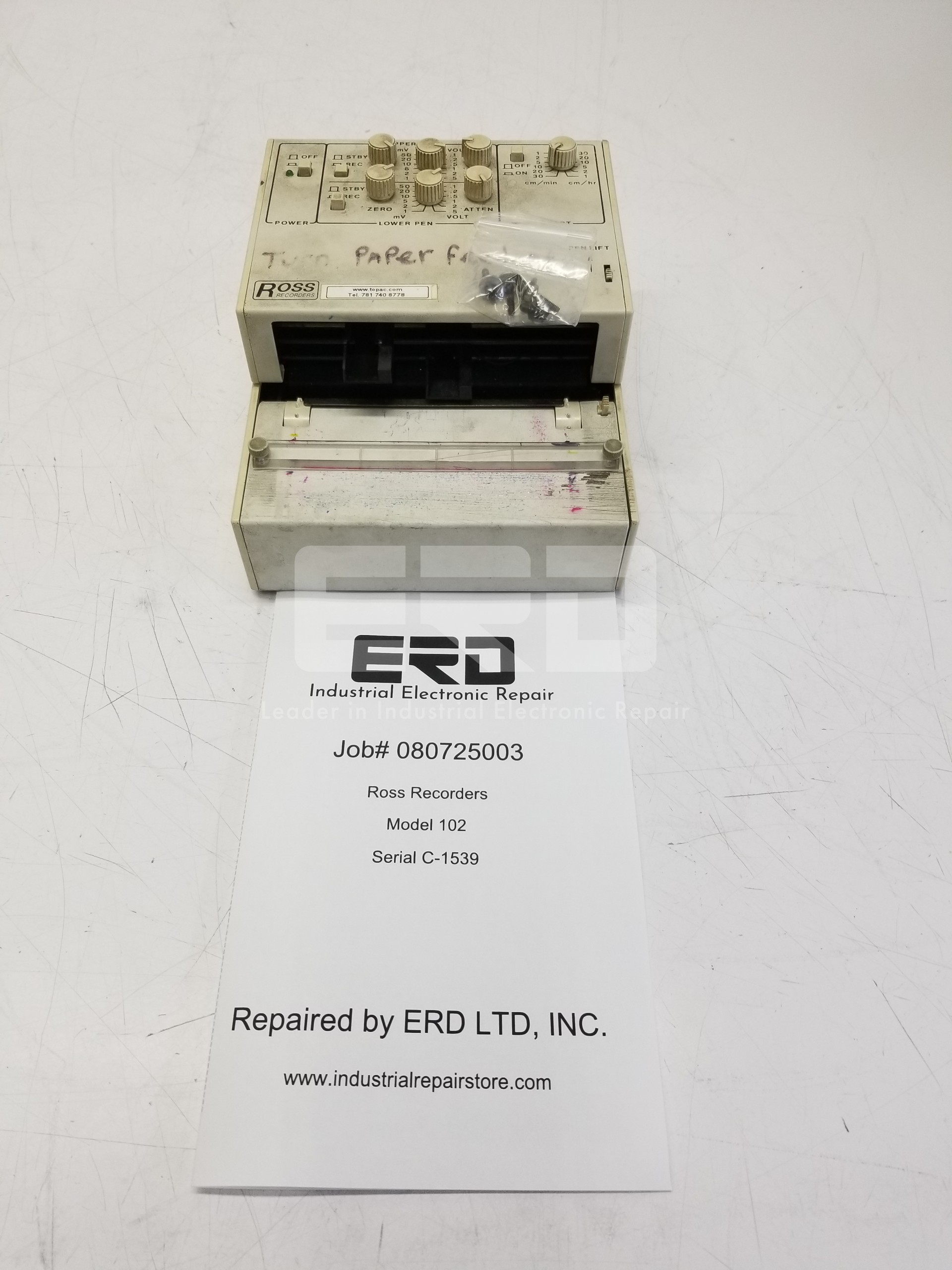 If you would like to have ERD repair your Ross Recorders Model 102 chart recorder, ship your unit to us at 705 Indeneer Drive, Kernersville, NC 27284. You will receive a firm quote on your Ross Recorders Model 102 chart recorder for your approval within 48 business hours upon receipt of your unit. If you need to speak with us, please call 1.336.992.3611 or visit our contact page at https://industrialrepairstore.com/contact-erd